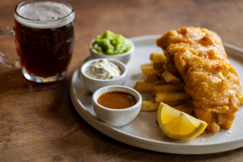 Beer-battered fish & chips, minted mushy peas, homemade tartare, curry sauce | 19 1657 kcals